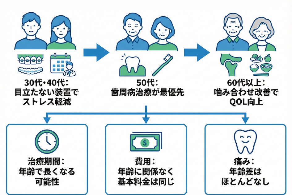 年齢を重ねると、骨が新しく作り変えられるサイクル(骨代謝)が緩やかになります。そのため、歯が動くスピードは若い世代に比べて遅くなる傾向があり、治療期間は数ヶ月から1年ほど長くなる可能性があります。また、虫歯や歯周病の治療が先に必要な場合は、その期間も加わります。 - ・費用:年齢による基本料金の変動はない