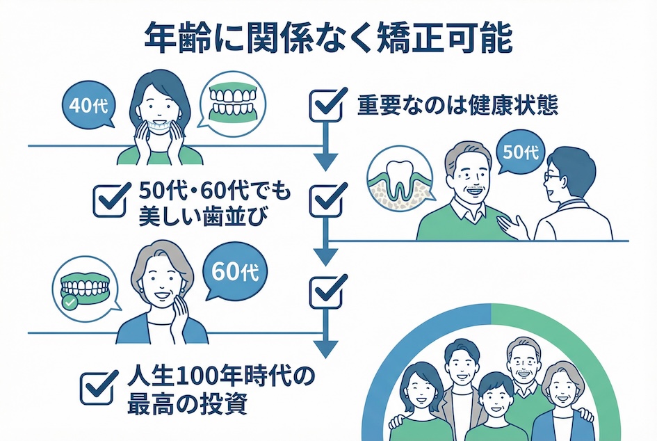 年齢を理由に、歯列矯正という選択肢を諦めていませんか。 しかし、繰り返しになりますが、歯列矯正に明確な年齢制限はありません。 大切なのは、年齢そのものではなく、現在の歯や歯茎の健康状態です。