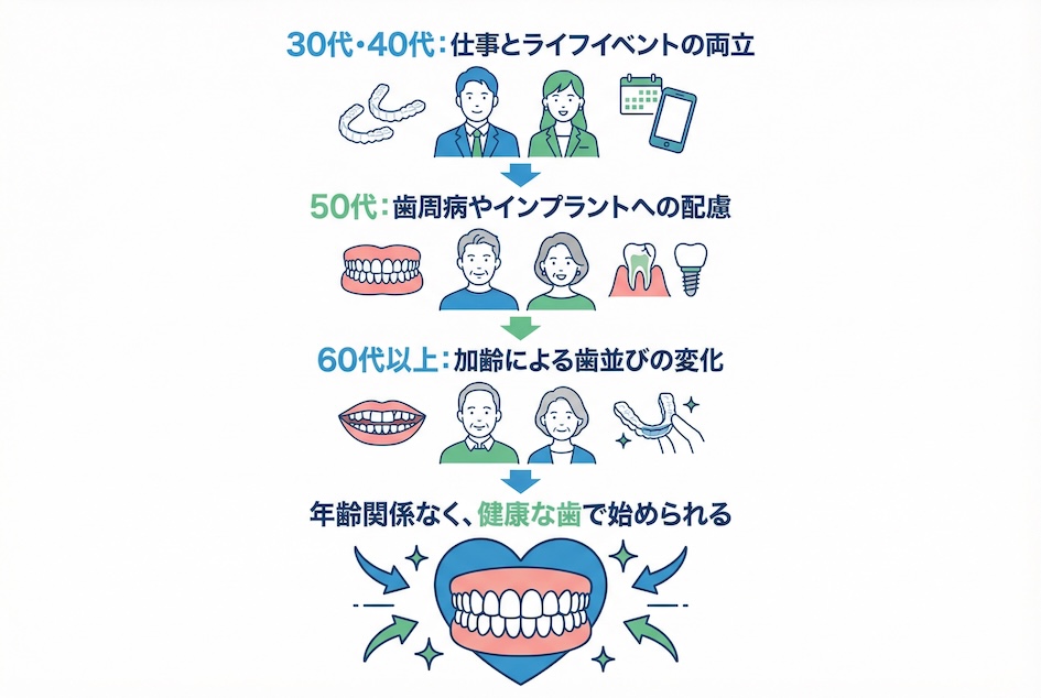 ただし、年齢を重ねるごとにライフスタイルやお口の中の状態は変化します。そのため、それぞれの年代に合わせた特徴や注意点を理解しておくことが、満足のいく治療結果につながる大切なポイントになります。