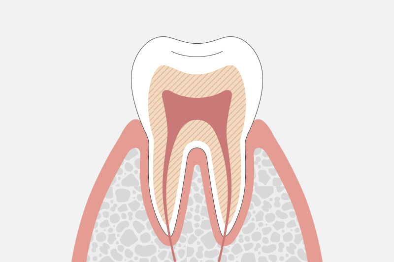 エナメル質の内側にある象牙質にまで虫歯が進行している状態です。冷たい物や甘い物がしみたり、ときどき痛むなどの症状があります。