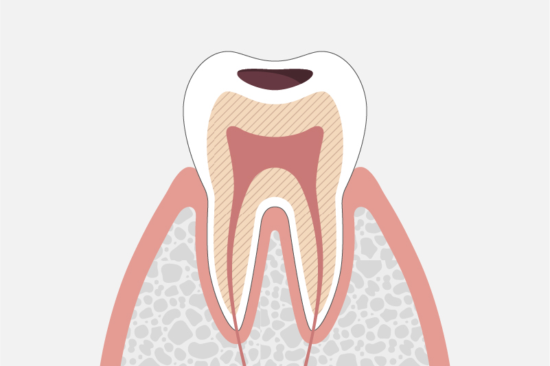 歯の表面のエナメル質がさらに溶け、黒ずんでいる状態です。冷たい物がしみる場合がありますが、まだ痛みなどの自覚症状はほとんどないことが多いでしょう。