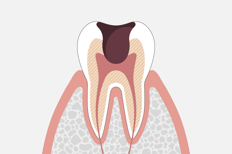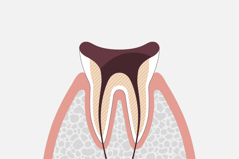 歯の大部分が溶けてなくなり、歯の根にまで虫歯が進行した状態です。歯の内部にある神経が死んでいることから、一旦は痛みはなくなりますが、歯根部に膿が溜まると再び痛みが出始めます。