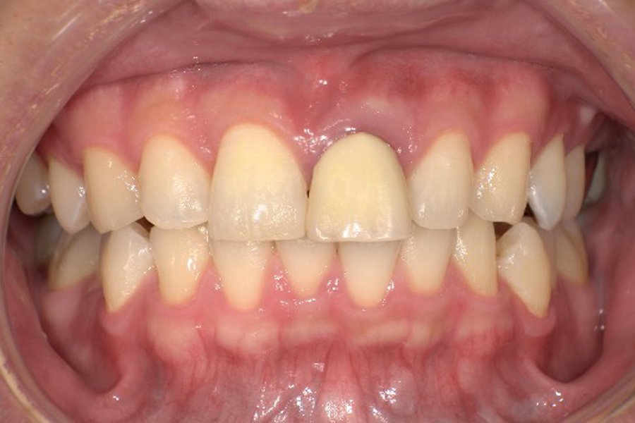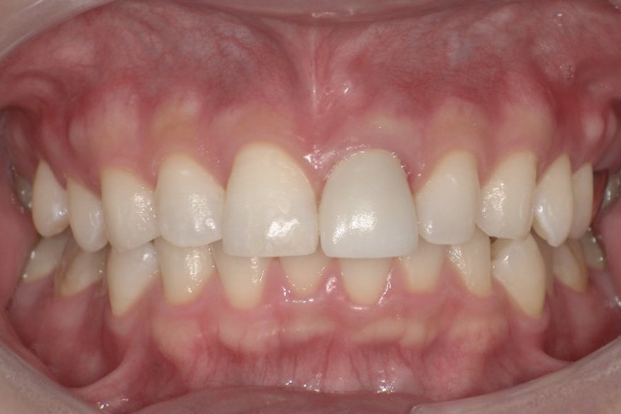 | 治療内容 | デュアルホワイトニング(ホーム+オフィス)で11トーン明るくし、その色に合わせて左上1番目の前歯をレイヤリングジルコニアクラウンで補綴しました。 |